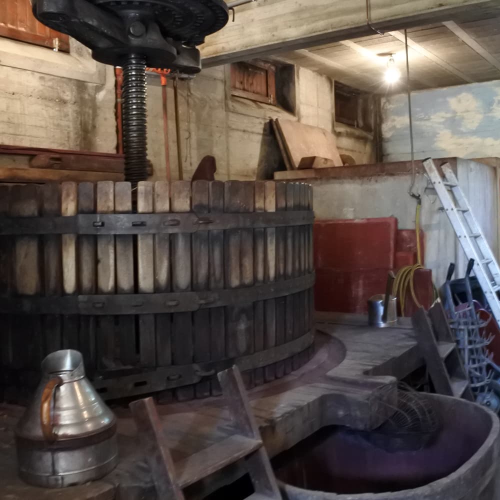 ランポンさんは浸漬後のぶどう果汁の搾汁に昔ながらの木製の道具を使用しています。よくワイン博物館で「昔使われていた道具」コーナーに展示してあるものが現役で使われています。