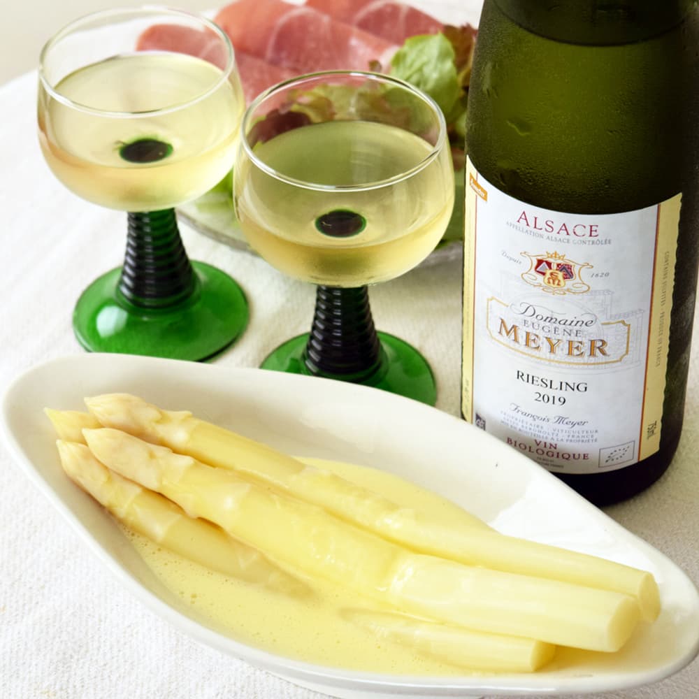 A bold, dry white wine made from Riesling, a noble variety in Alsace, which is famous for its white wines. It has a fruity aroma reminiscent of grapefruit, apples, and quince, as well as white flowers and herbs. It has a clean finish with a sense of strength. This organic wine goes well with cooked fish dishes, as well as pork dishes such as the Alsace local dish choucroute.