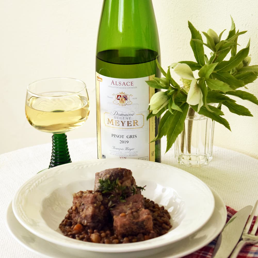 This fruity and mellow white wine is made from the noble Pinot Gris grape variety in Alsace, which is famous for its white wines. It has a fruity aroma reminiscent of ripe kumquats and other fruits, with a refreshing mineral feel. This organic wine goes perfectly with pork.