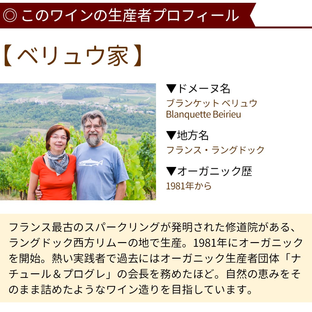 A slightly sweet sparkling wine made in the Languedoc region of southern France. Made using an ancient method that does not add sugar, it has a gentle taste that retains the natural sweetness of the grapes. It has a flavor reminiscent of white flowers and apples, and has a low alcohol content of around 8%. The producer, Mr. Belleu, is a passionate organic winemaker who also served as the former president of Nature et Progres. This is a carefully crafted organic wine made without the addition of any antioxidants.