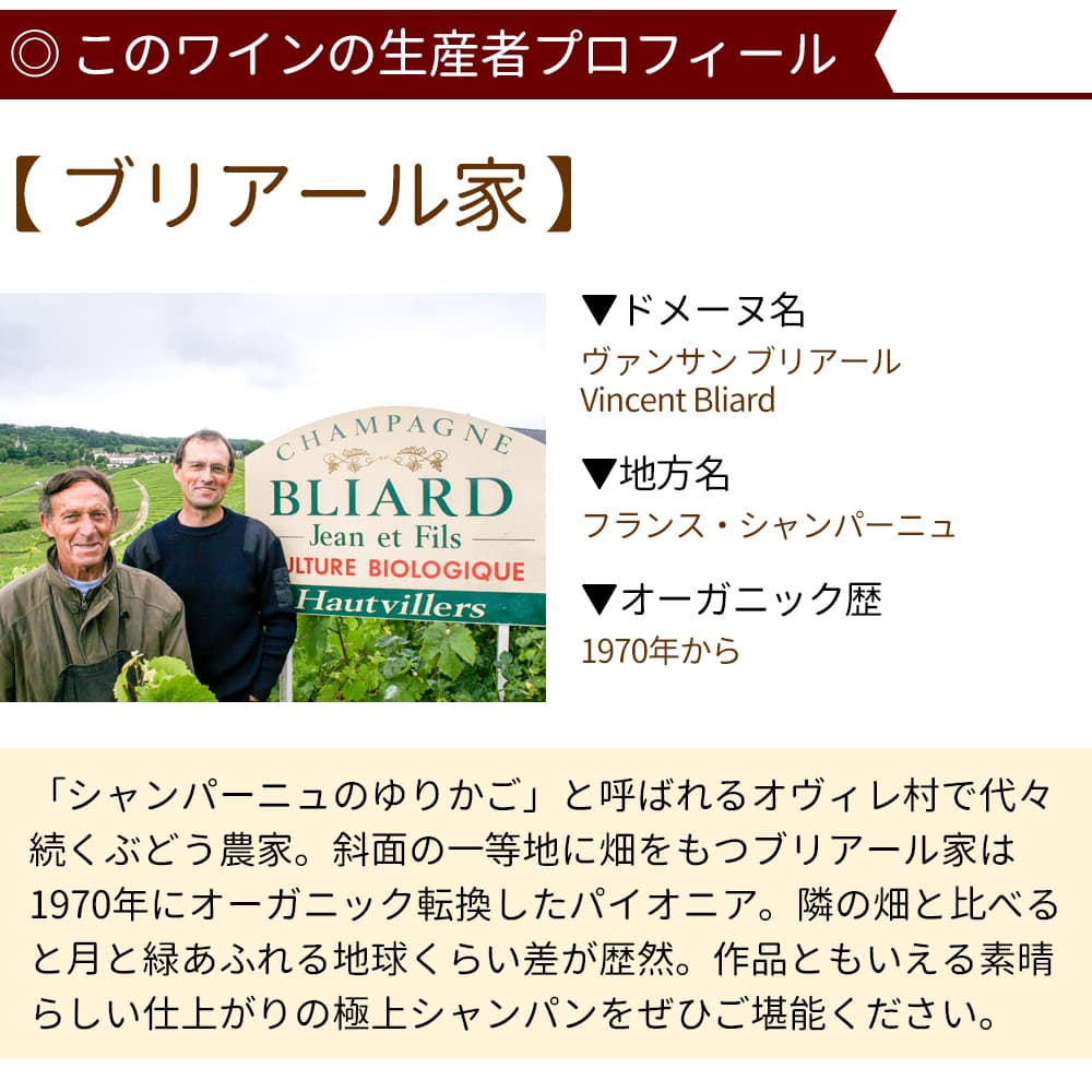 Located in the village of Auville, known as the "cradle of Champagne." This small-scale producer, which does everything from grape cultivation to brewing and bottling, was able to acquire a vineyard in a prime location on a south-facing slope in the 19th century. Because of its location, it is influenced by both the Atlantic and continental climates. The temperature is low throughout the year and the hours of sunshine are short, but this creates the delicateness that is unique to Champagne. In 1970, when it was said that organic winemaking was impossible in the Yampagne region, the previous head of the Briard family decided to make an organic change. As he says, the soil in the vineyards is overwhelmingly the most important part of the work, and the soil in the vineyards is soft and produces high-quality grapes. Although grape juice can be pressed up to the second pressing, only the juice from the first pressing is used, and the wine continues to uphold the Briard family tradition.