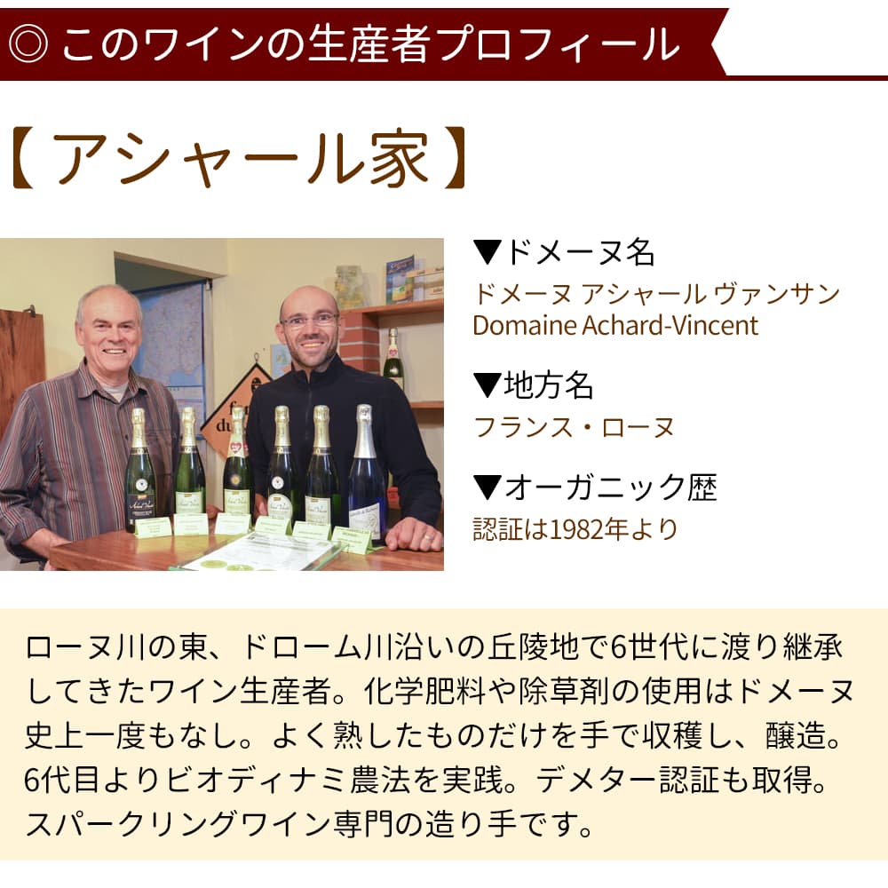 This organic wine farm has been in business for six generations and is located in Dey, which is located right in the center of the Rhone region. The hills at an altitude of 400 meters are sunny 300 days a year and have a large temperature difference between day and night, making it an ideal environment for grape cultivation. They have protected their fields without ever using pesticides or chemical fertilizers. They obtained organic certification in 1982. In order to increase the vitality of the soil in the fields and better express the characteristics of the land, they have been using biodynamic farming methods since 2005. The Achard family is a true bubbles craftsman who has dedicated their lives to bubbles and only makes bubbles. They are committed to capturing the splendor of nature and delivering it as aroma in the glass.